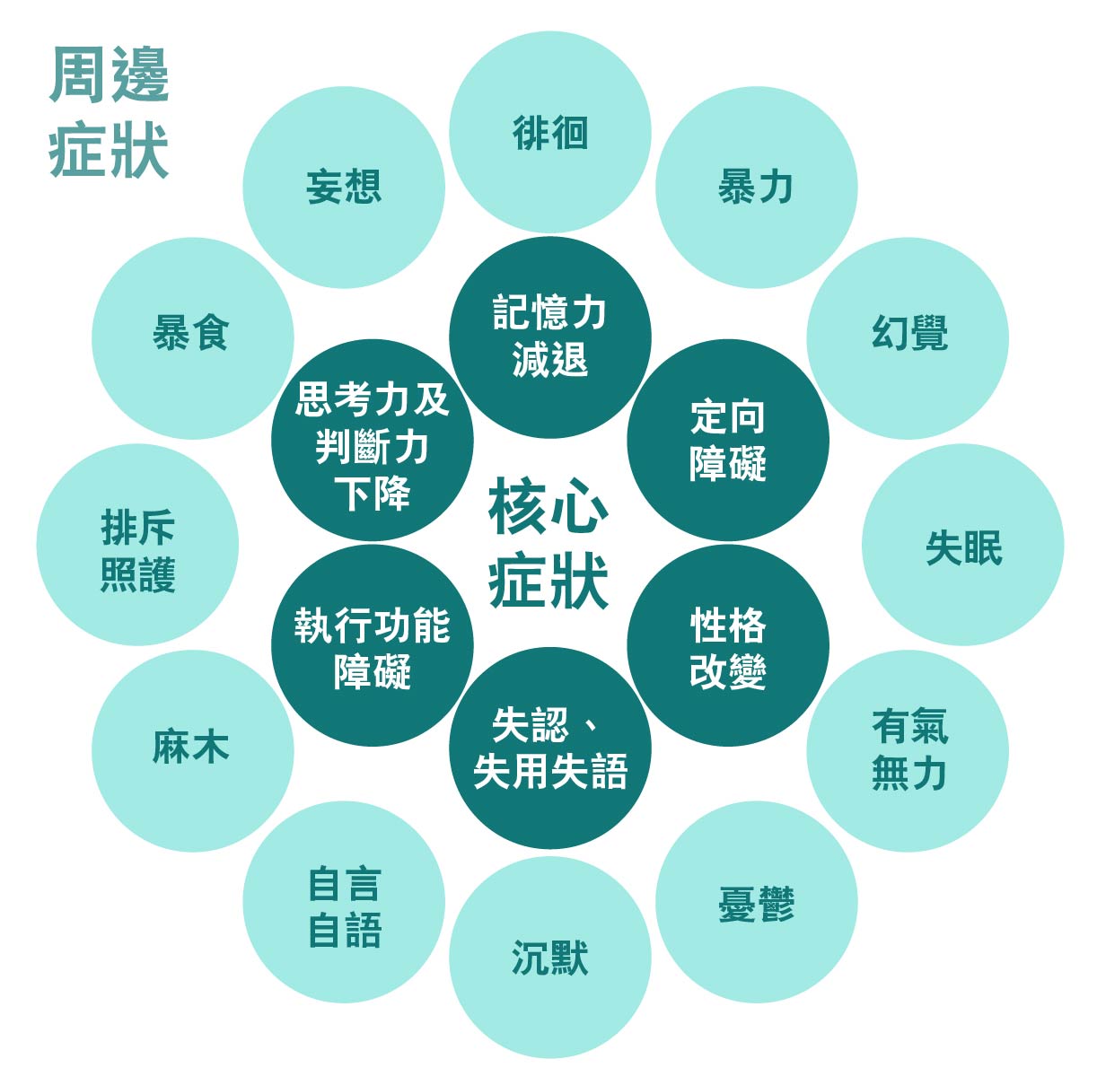 失智症的核心症狀包括記憶力減退、定向障礙、思考和判斷力下降、性格改變以及執行功能障礙和失認、失用、失語等。而周邊症狀如徘徊、暴力、妄想、幻覺、暴食、失眠、拒絕照護、缺乏動力、麻木、自言自語、沉默和憂鬱等,則反映患者因病未獲適當支援而產生的行為及精神問題。