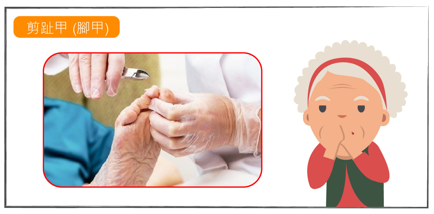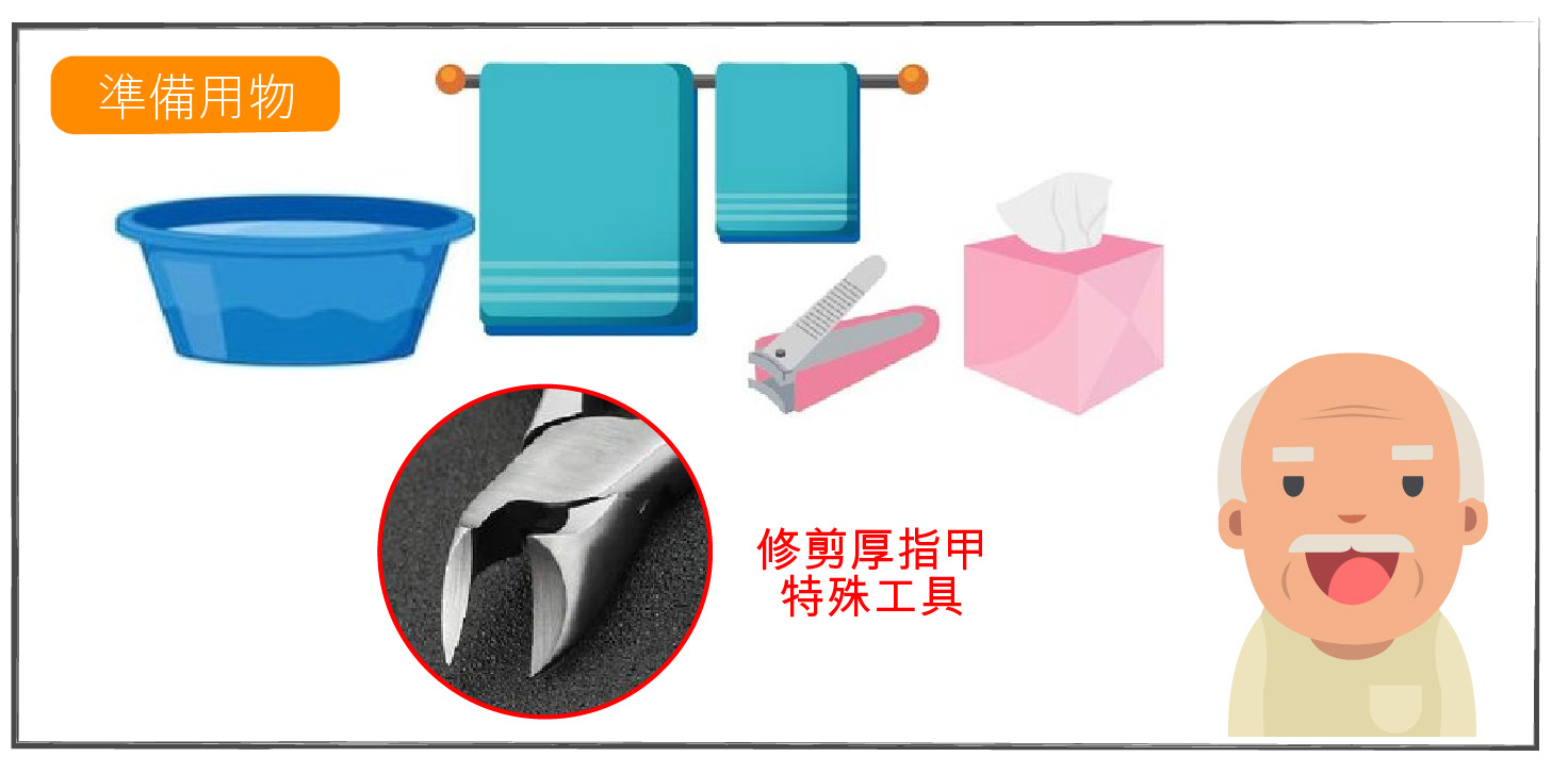 - 準備該長者專用的臉盆、 指甲鉗、指甲挫刀、毛巾、肥皂、乳液和41-43℃的溫水;