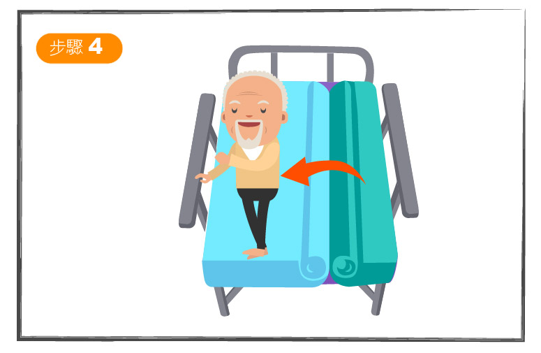 將病人越過床單翻向對側,並將另一邊的床欄拉起,讓病人抓住床欄以防跌落。