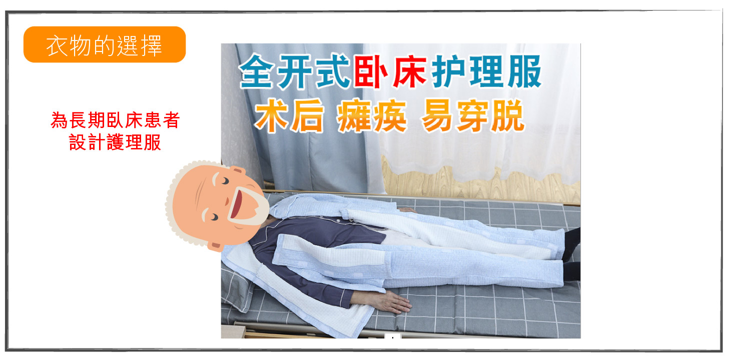 在長期病患的衣物選擇上應遵循舒適、保暖、寬鬆、方便穿脫的原則,兼顧易清潔、安全、透氣、耐用以及適應性等因素,全面照顧病患的穿著需求。以病人的健康和自理能力為首要考慮,使其在漫長的康復過程中更加從容自在。