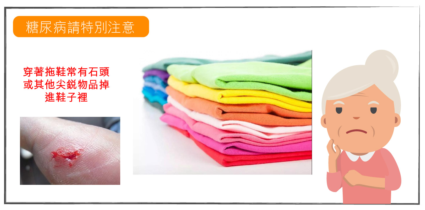糖尿病患者應避免穿著拖鞋,容易被石頭或其他尖銳物品扎傷,引起皮膚或傷口感染。盡量選擇穿著寬鬆的純棉衣物,避免羊毛或化纖內衣,以免造成皮膚瘙癢。適當增加衣物換洗頻率,定期消毒毛巾,保持床單乾燥清潔。