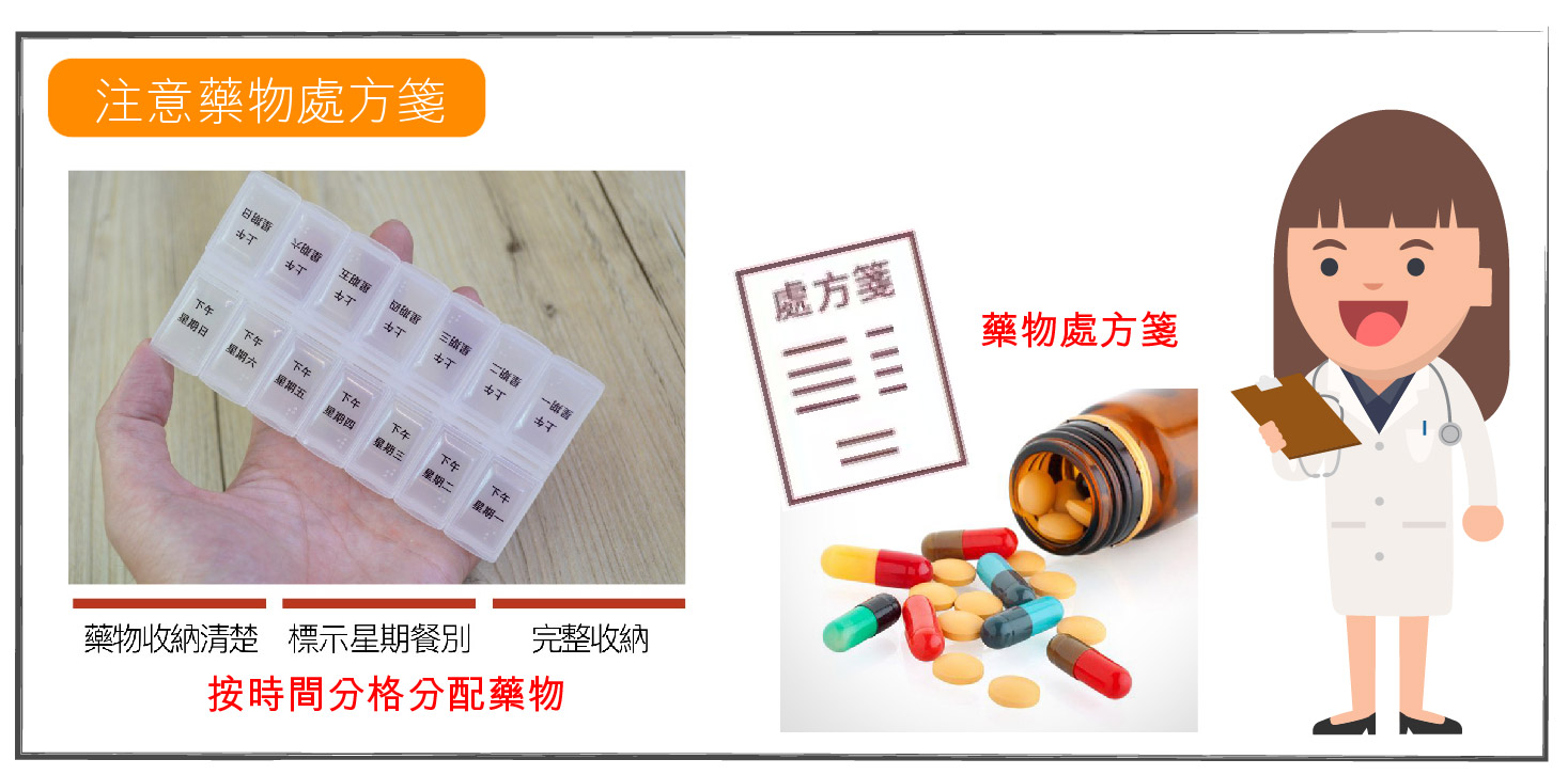 居家照護病患大多有慢性疾病病史,如:糖尿病、高血壓等,而慢性疾病都需長期服用藥物,且服用藥物種類繁多,家屬時常為了被照護者何時該吃什麼藥的問題而困擾。所以,拿到醫師藥物處方箋時,如有不懂的地方,應立即詢問在場的醫生或執藥師有關藥物作用及每種藥物給藥的頻次,並標識清晰,方便給藥。