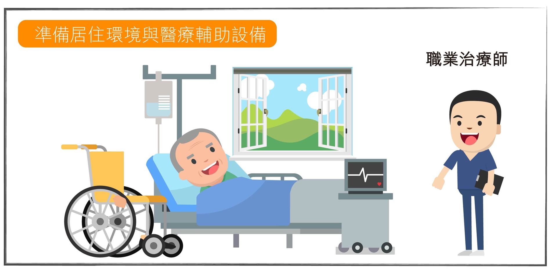 - 合理布局家具,留出足夠的活動空間。必要時添置病床、氧氣機等。 - 無障礙通道