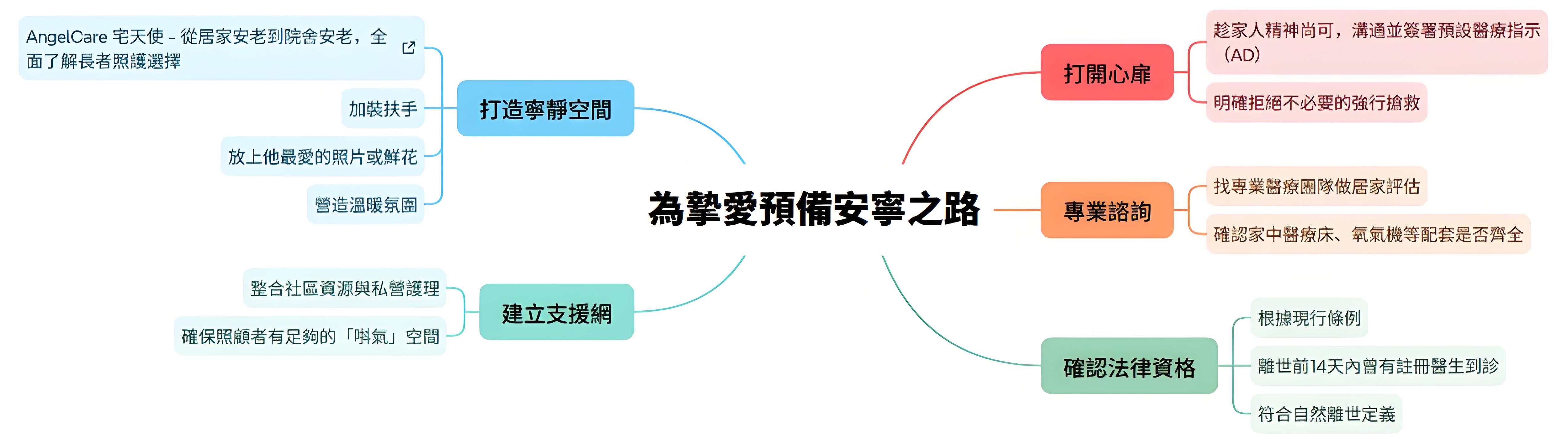 4. 法律文件簽署(如預設醫療指示);5. 殯儀諮詢(預先與殯儀公司商討遺體接送流程)。
