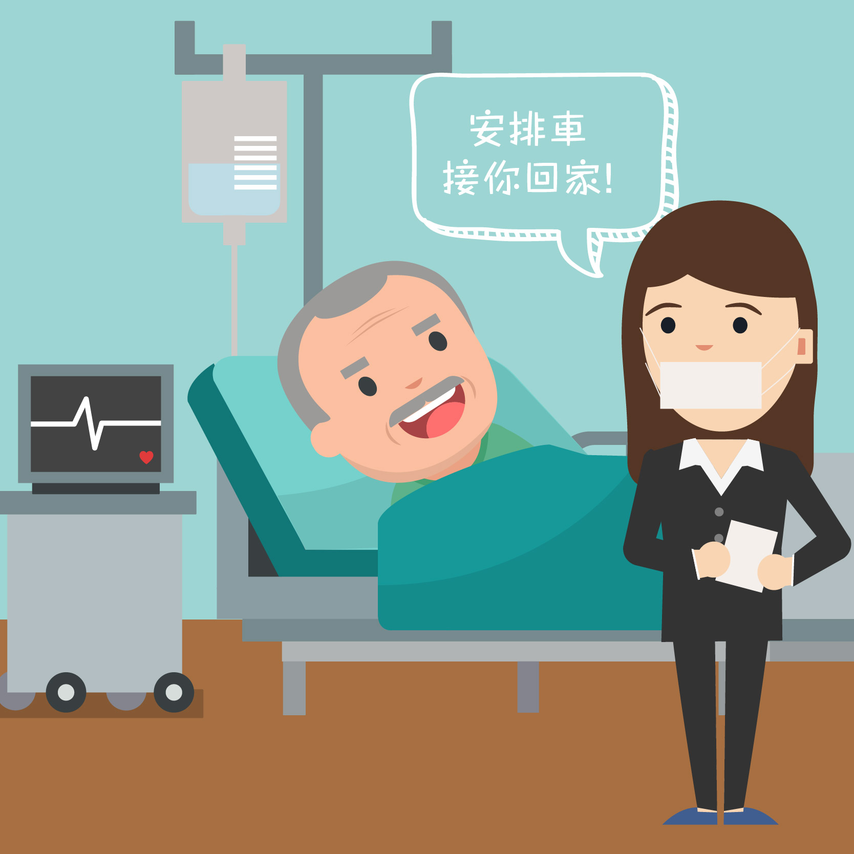 - 老友宅醫與家屬協商到達目的地後的運送方式及安排隨行護送人員;