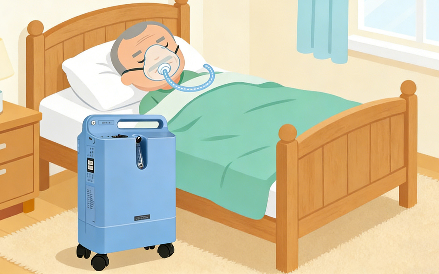可以,且對於許多血氧在夜間下降的患者來說,這是必要的。夜間吸氧能改善睡眠品質,減少晨間頭痛。由於機器有運轉聲,建議使用較長的鼻管將機器移至房門外,以減少噪音對睡眠的干擾。